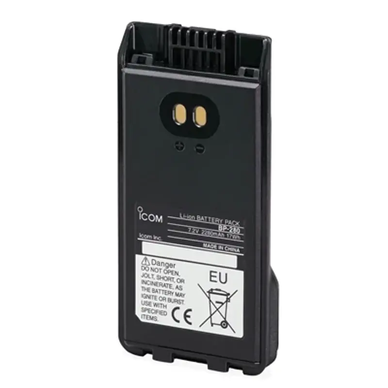 The Icom BP-280 is a high-capacity Lithium-Ion (Li-Ion) battery pack, designed to offer extended operating times for users of Icom communication devices. With a capacity of 2280mAh and a voltage of 7.2V, it provides approximately 18 hours of operating time, ensuring reliable performance throughout long shifts or operations. This battery is specifically compatible with a range of Icom radios, including the IC-F29SR, IC-F1000/F2000 series, and the IC-F1000D/F2000D series, making it a versatile power solution for various communication needs.