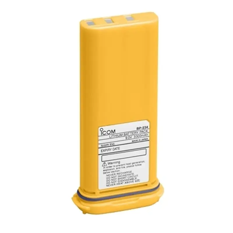 The Icom BP-234 is a high-capacity, non-rechargeable Lithium battery pack, designed to deliver exceptional performance and reliability for specific Icom devices. With a voltage of 9.0V and a capacity of 3300mAh, this battery pack is engineered to provide long-lasting power, ensuring that users can rely on their communication devices in critical situations. It is specifically suitable for the IC-GM1600 and IC-GM1600E models, making it an essential accessory for these devices. Despite being non-rechargeable, the BP-234's Lithium-ion chemistry ensures a stable and durable power source, ideal for emergency and safety equipment where reliability is paramount.