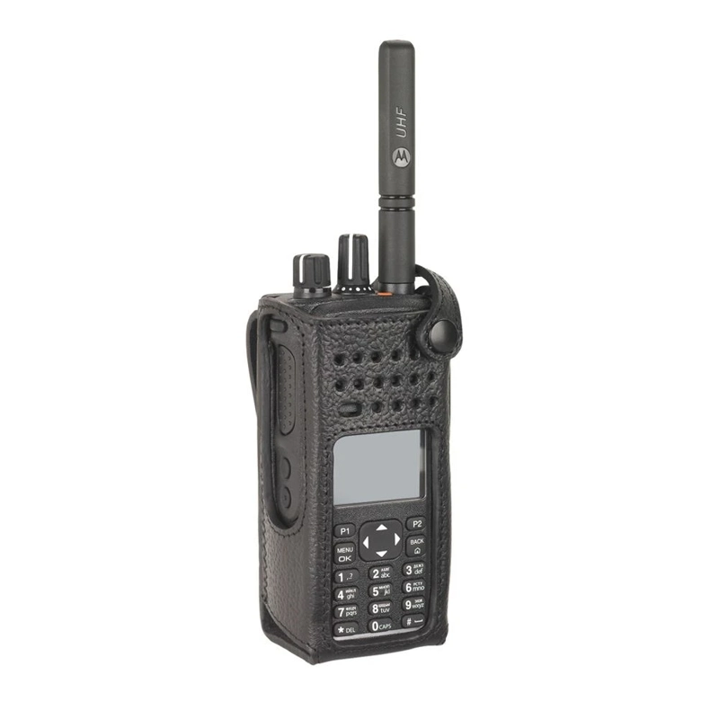 The Motorola PMLN5838A is a hard leather carry case designed for the DP4000 series display radios, including DP4600, DP4601, DP4800, and DP4801 models. It features a 3-inch fixed belt loop for secure attachment and is crafted to fit the radio and battery precisely while allowing clear audio transmission.