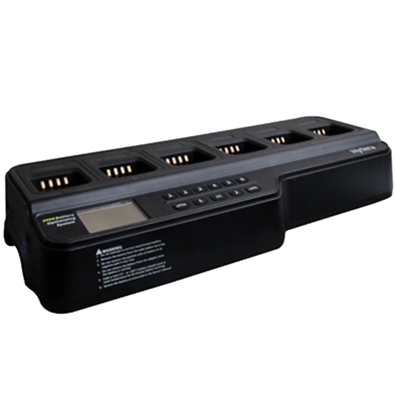 The battery optimizing system MCA05 has charging units for up to 6 batteries or 6 handheld radios. Information about the battery is displayed on the LCD display. The system can no only charge and discharge batteries, but also run battery power tests.