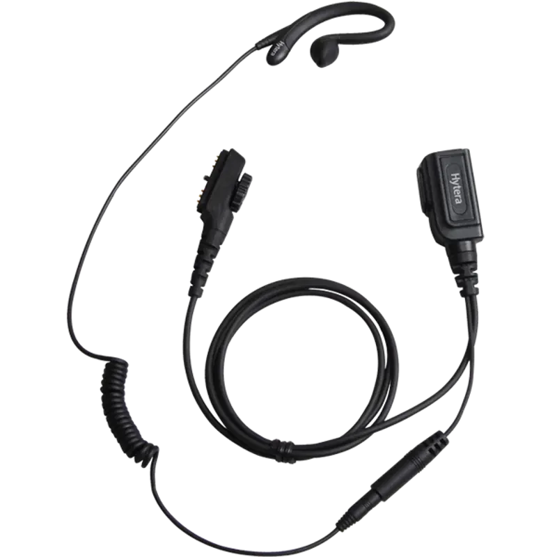 Hytera PD700 series C-style earpiece with in-line push to talk and microphone in black.