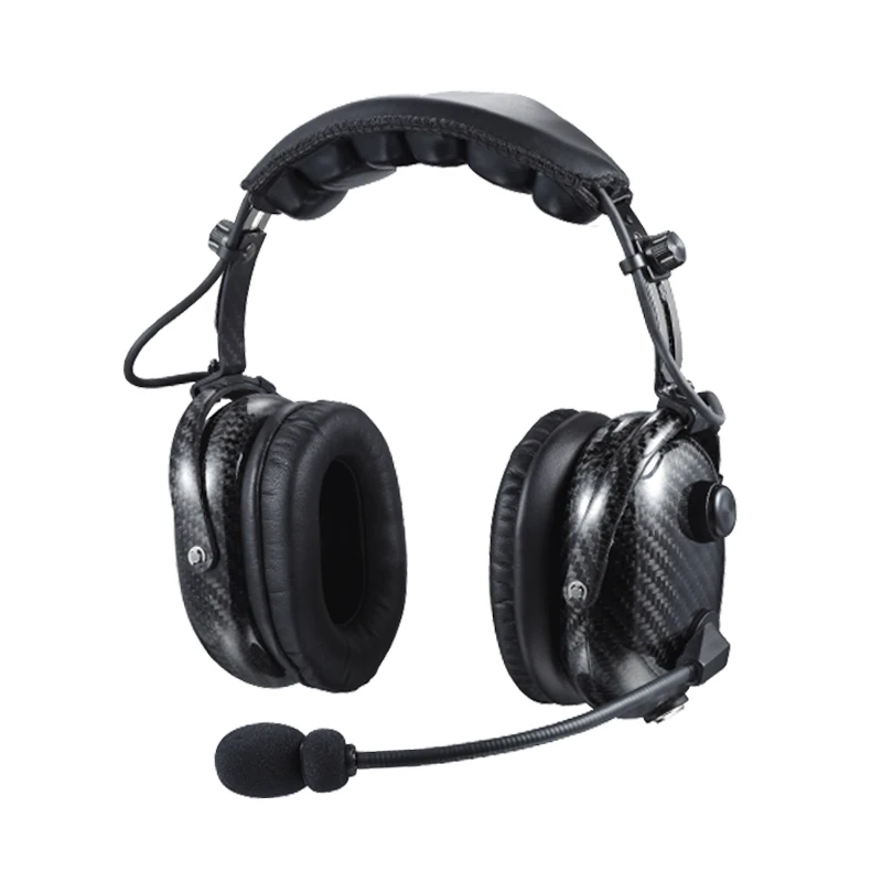 Carbon fibre noise cancelling microphone and a lightweight headset. This headset features a push to talk button on one cup and volume control on the other.
