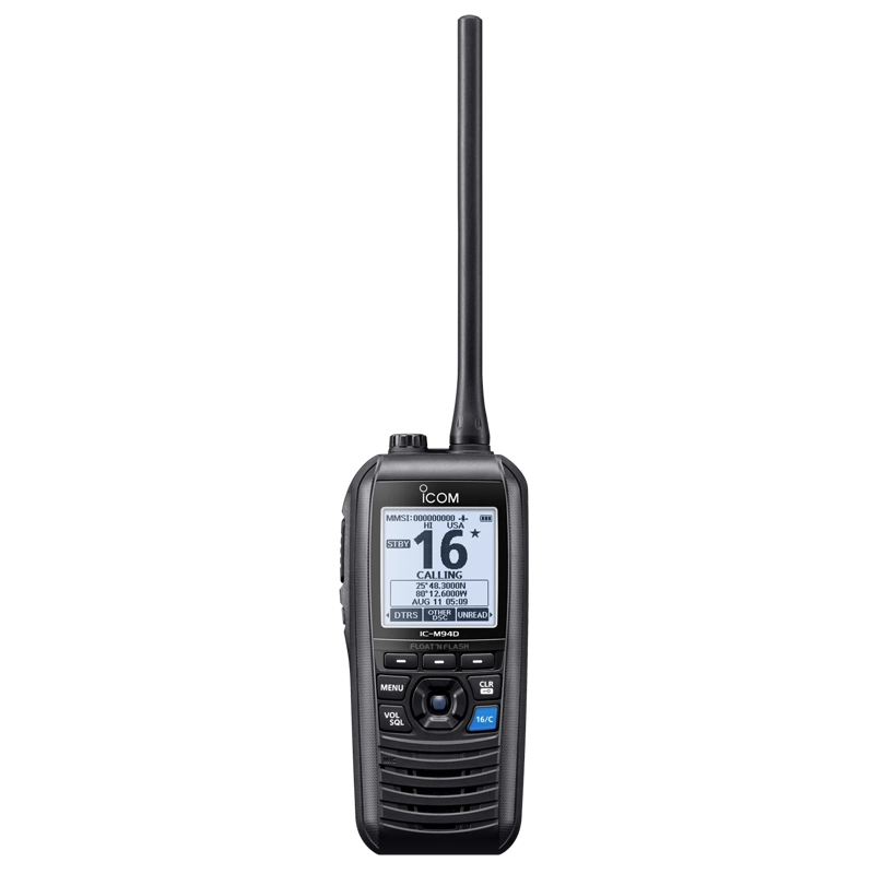 The IC-M94D is IPX7 submersible, and safety features include Float 'n' Flash, Man Overboard and integrated GPS receiver.