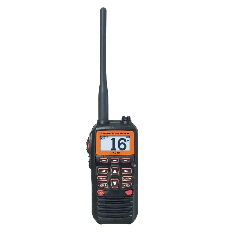 Standard Horizon's HX210E handheld VHF marine radio is cost-effective, compact and lightweight, with a high resolution backlit display, 600mW loud audio output, and 6W transmit power output for greater range.